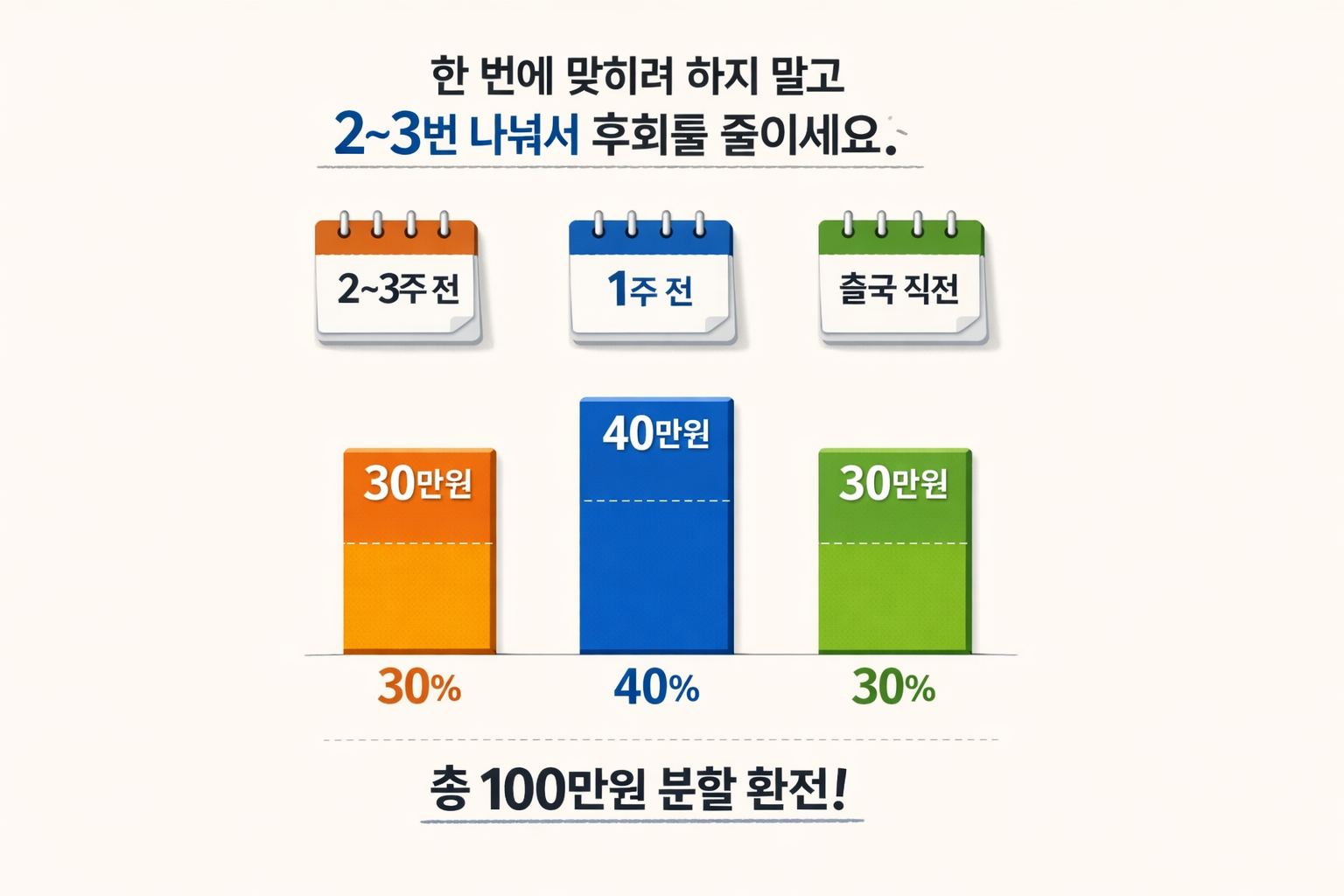 - 예: 100만원 환전 시 → 30만원 / 40만원 / 30만원 분할
