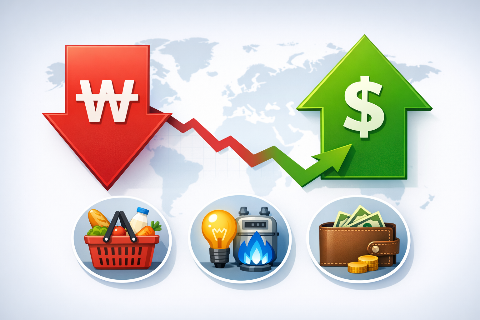 근데요, 이게 진짜 중요해요. 환율이 오르면 단순히 해외여행만 비싸지는 게 아니라, 우리 집 장바구니 물가부터 전기료·가스비까지 전부 영향을 받습니다.